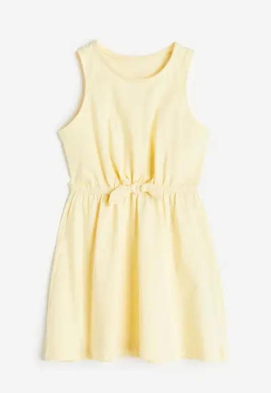 Платье без рукавов из мягкого хлопкового трикотажа с круглым вырезом, эластичным швом и завязкой на талии. Длина: до колена Длина рукава: Без рукавов Вырез: Круглый вырез Описание: Светло-желтый, Сплошной цвет. Концепция: ОСНОВЫ Тканина: 100% бавовна Цвет желтый Размер в наличии на рост: 110/116см