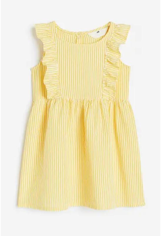 Платье без рукавов из воздушного жатого хлопка с круглым вырезом, пуговицами сзади, оборкой на плечах и слегка юбкой. Длина: до колена Длина рукава: Без рукавов Подходит: Обычная посадка Стиль: Расклешенный Вырез: Круглый вырез Описание: Желтый/Белый, Полосатый Тканина: 100% бавовна Размер в наличии на рост: 122, 134, 140см