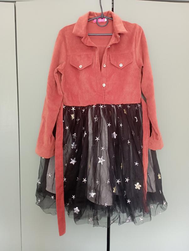 Красивое нарядное платье с поясом. Застегивается на пуговицы. На рукавах также. Низ украшен звездочками из пайеток. Дополнительные замеры по запросу;)