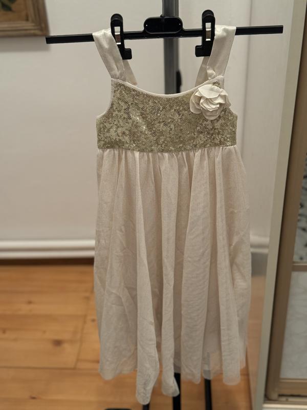 Детское платье свободного кроя. Вверх-окрашенный пайетками золотистого цвета и цветком. Низ- сеточка в мелкий горох с напылением.