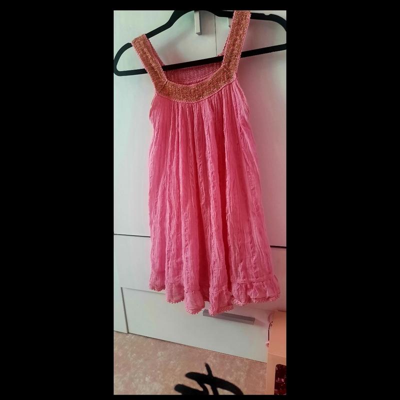 очень красивое платье.Длина 69 см, полуобхват груди 43 см.Вельное кроя.На лето супер.Цвет насыщенный розовый как на последнем фото.80%котон.Пошив Греция.