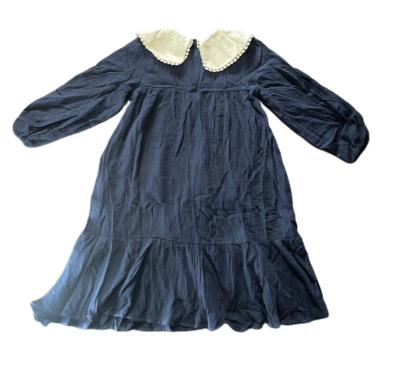 Платная синяя с белым воротником Рост 140 см, 10 лет Материал: 100% хлопок Платье расклешенное от груди Застегивается сзади на молнии Обхват груди 86 см Длина рукава от предплечья 48 см Длина платья 82 см