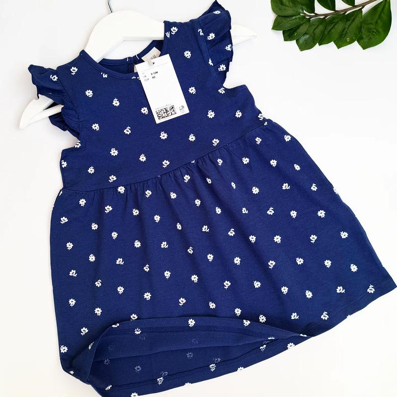 Платье для девочки из мягкого хлопкового трикотажа. Сзади на шее застежка на пуговицу, рукавчики-бабочки, расклешенная юбка с легкими воланами. Цвет: синий в белую ромашку. Размер: 80 (9-12 мес.) 86 (12-18 мес.) 92 (18-24 мес.) 98 (2-3 года) 104 (3-4 года)