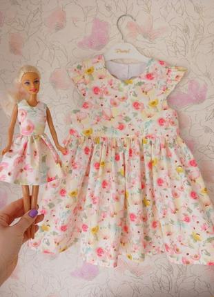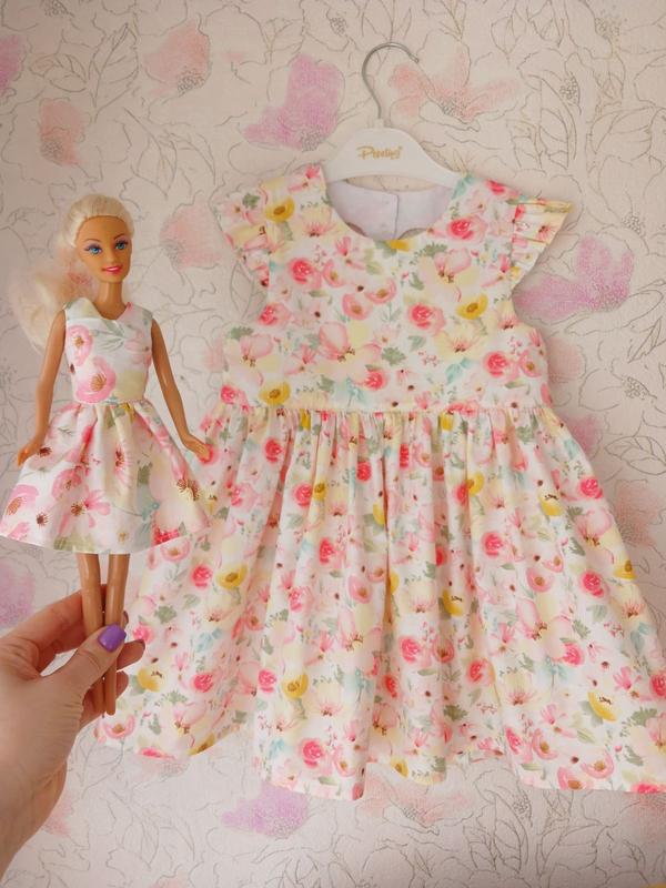 Платье сшито из 100% хлопка. На спинке вырез в виде сердочки. В подарок идет платье для стандартной барби на липучке. В наличии размеры 98 98-длина 52 см полуобхват по груди 30 см