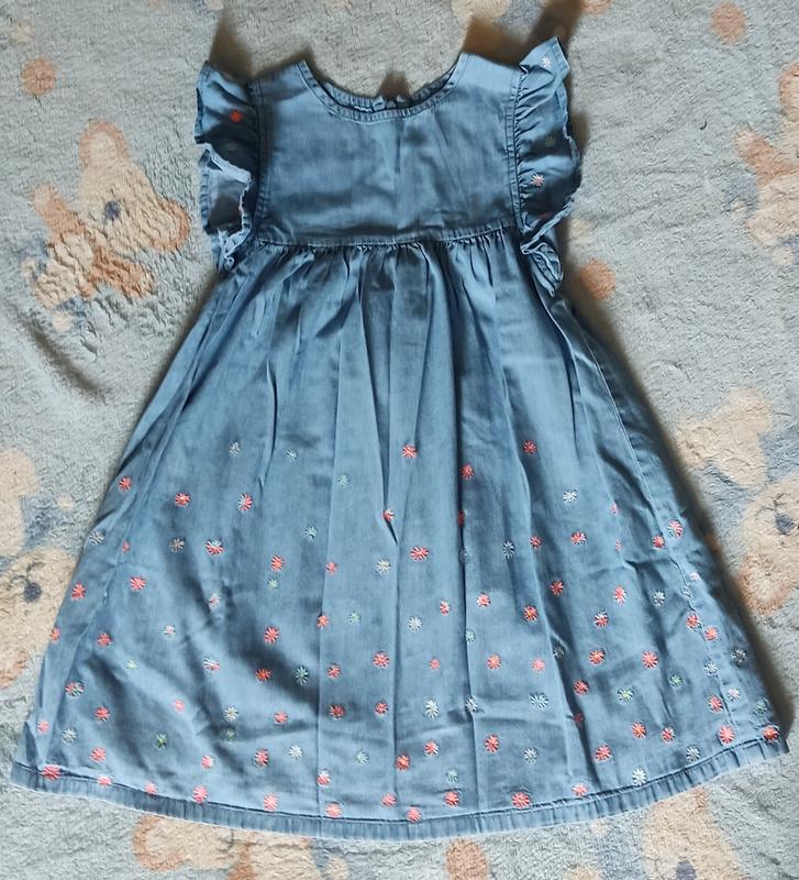 Очень красивое джинсовое платье для девочки на р.110, но хорошо будет даже на 116 (на фото ребенок имеет именно такой рост). В идеальном состоянии. По спинке потайная молния.