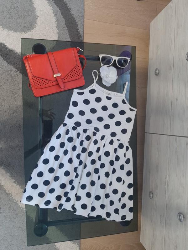 Летнее платье белого цвета в горошек на брителях.
