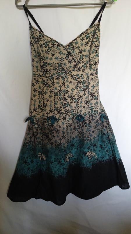 красивое платье,коттон, длина по боковому шву от подмышки до низу73, пог36 и тянется45,на спинке резинки,пояс полуобхват40, бретели регулируются