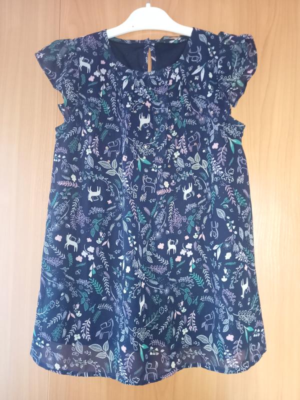 Милое платье с приятным девчачьим рисунком. На подкладке, спереди расшита золотистыми пайетками. Идеальный вариант для лета, не марка, отлично стирается, не мнется. Полуобхват груди - 37 см, полуобхват низа - 57 см, ширина плеча - 27 см, длина изделия - 59 см. В подарок - синяя юбочка gap.