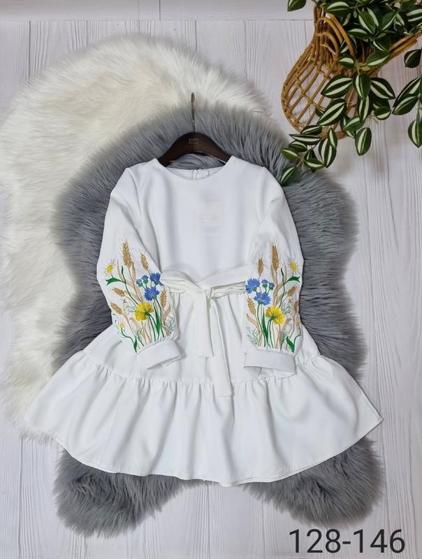 💞✨️Невероятно красивое и нежное платье На рукавах вышивка ткань костюмка барби по спинке застегивается на молнию, поясок в коплекті 128(1 шт)-длина 69,рукав 45, пог 33 134(2 шт)-длина 71,рукав 48, пог 34 140(2 шт)-длина 74,рукав 50, пог 36 146(3 шт)-длина 76,рукав 52, пог 37 +-2 см