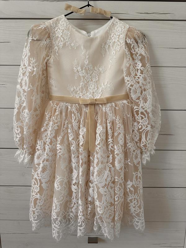 Платье шитое по заказу. На 5-7 лет Белый гипюр, мериживо. Подкладка телесного цвета. Поясок съёмный Длина-73-74 см Пояс-29-30см Рукав-44-45 см ОдГали один раз