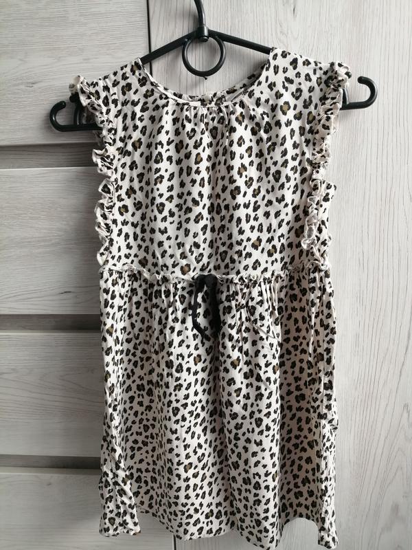 Платье на девочку 122-128р. Длина - 57см. Есть стрелка на комках, но за счет принта в глаза не бросается. Ткань приятная.