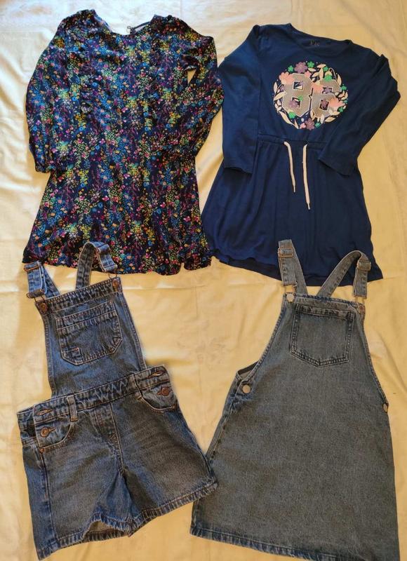 Платье в хорошем состоянии, в наборе идут два платья, сарафан и комбинезон. Платье из тоненьких ткани на лето. Замеры Платье с шнурочками Длина - 67 см. Грудь - 35 см. Рукав - 44,5 см Платье с цветками Длина - 67 см. Грудь - 35 см. Рукав - 50 см. от шейи Сарафан Длина - 52 см. без шлеек. Пояс - 33 см. Комбинезон Длина - 48 см. без шлеек. Пояс - 30 см. Вещи подойдут больше для двора. Цена указана за весь набор вещей.