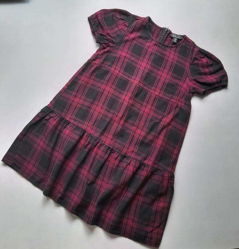 Стильное платье свободного кроя в клетку, хорошо подойдет для школы и повседневной жизни, идеальное состояние, размер 140 на 10-12 лет, длина 72 см, между плечами 29 см, под подмышками 38 см.