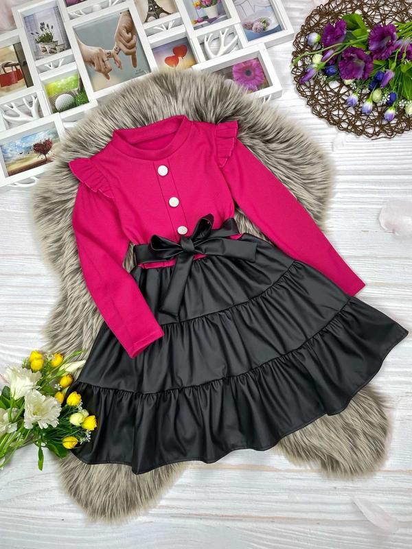 Цена 700 грн Стильное нарядное платье для красавиц 💗 Ткань трикотаж рубчик + экокожа, эластичная, приятная к телу Завязывается под поясок, отделка пуговицы Замеры: длина/пог/рукав от плеча 116 - 62/32/42 122 - 66/33/44 128 - 67/33/46