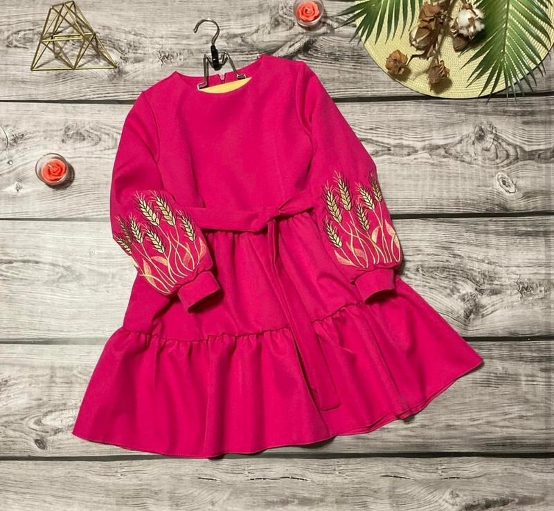 Невероятно красивое и нежное платье На рукавах ВИШИВКА!, не малюнок. По спинке застегивается на молнию. Пояс в комплекті. Ткань - костюмка барби. 140 длина-74см, полуобхват груди - 36см, рукав - 50см.