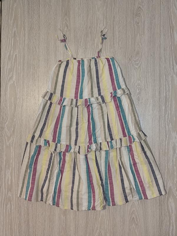 Фирменное длинное платье сарафан в радужную полоску на 7-8 лет. В грудях резинка. Тканина 100% бавовна. Стан - идеальный Замеры: длина по спинке от плеча 80 см, ширина между подмышками 27 см