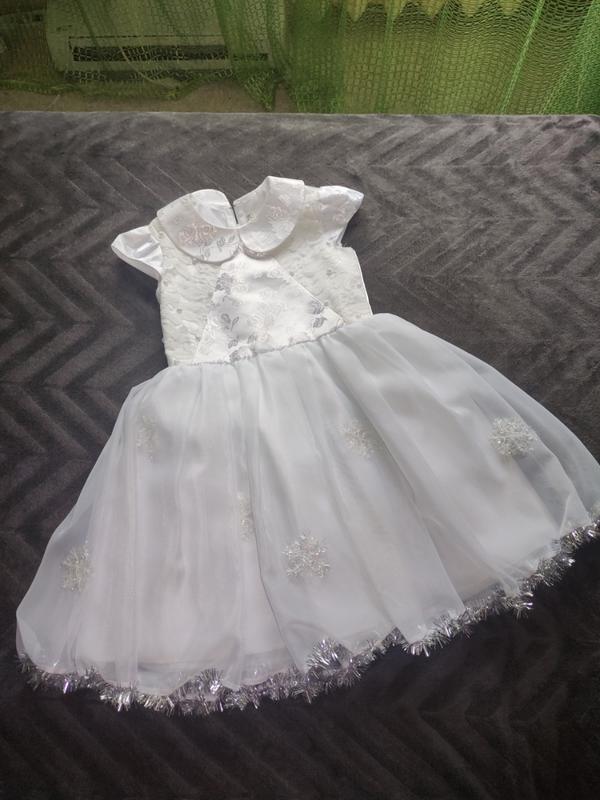 Праздничное платье, костюм снежинки, потому что украшена снежинками и дождиком, но можно снять. Длина 66 см, пояс 29 см, от плеча до пояса 24 см юбка 42 см. Верх атласный, них имеет пышную юбку