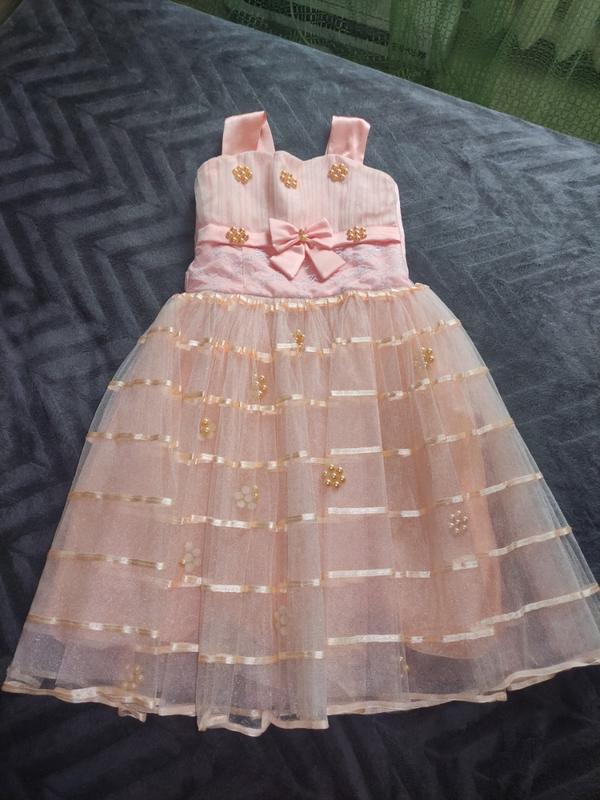 Праздничное платье, длина 80 см, пояс 32 см, от брители до пояса 32 см. Очень красивый персиковый цвет.