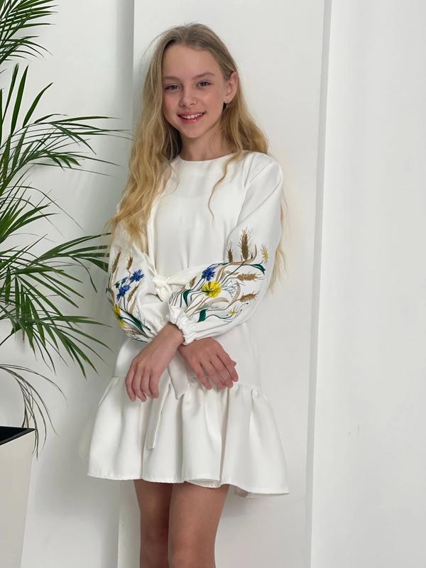 🧡В наявності 🧡 Неймовірно гарна та ніжна сукня На рукавах вишивка Пояс в комплекті Можна носити з поясом і без Тканина костюмний креп заміри:пог/рукав/довжина 128/38/50/68 164/46/54/79 +-2см