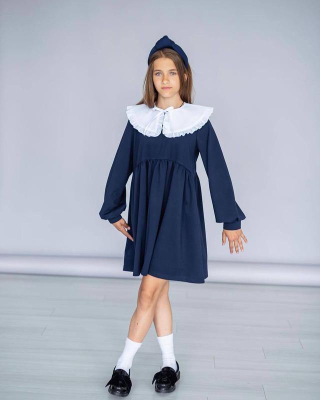 Платье со съемным воротничком арт. sev. 1079 Размеры: 122, 128, 134, 140, 146, 152 Ткань: качественная креп костюмка Цвета: темно-синий Лаконично и стильно одновременно! Образ, который будет красиво смотреться не только в первый сентября! Сарафан свободно кроя, не сковывает движения. Подходит под любой образ. Воротничок завязывается, перчатки на пуговице.