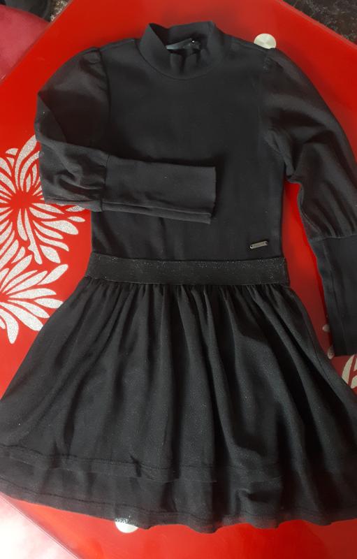 Это платье подойдет как для особенных дней, так и на каждый день. Стан идеален. Верх и манжеты выполнены из плотного хлопкового трикотажа в рубчик. Юбка и рукава из фатина. Юбка состоит из двух слоев фатина и подкладки. Заниженная линия талии подчеркнута широкой резинкой с блестками. Сбоку пришит логотип бренда. Замеры: ПОГ 29/35, ПОТ 27, длина 67, рукав 46. Подойдет на девочку с ростом 128/134 см.