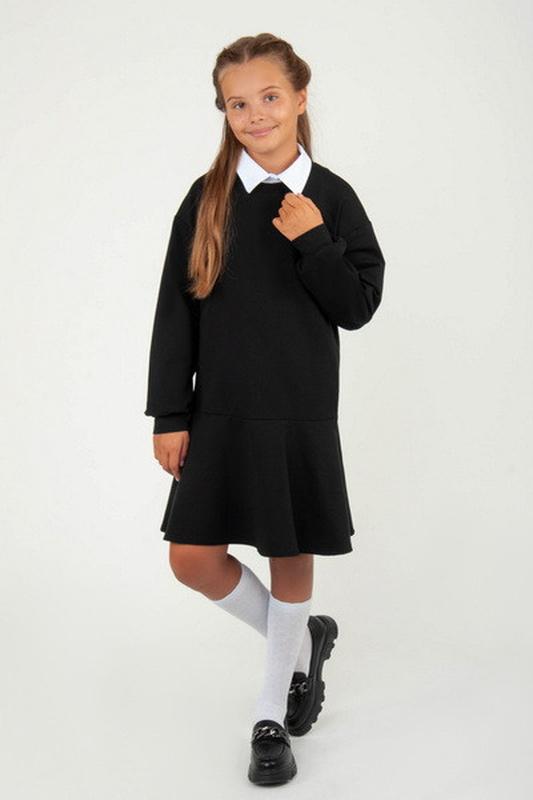 Представляем стильную новинку - платье в школу. Модель выполнена из полотна "Довнитка". Верх платья - со спущенным плечом, по типу "Реглан" и белый съемный воротник, который фиксируется на кнопки, низ платья имеет юбку "Полусолнце". Платье выполнено в базовых цветах – серый и черный, спереди украшено лаконичной вышивкой. Полотно: двонитка Состав: 95% хлопок, 5% элестан. Рекомендации по уходу: стирать при температуре не более 30 градусов.