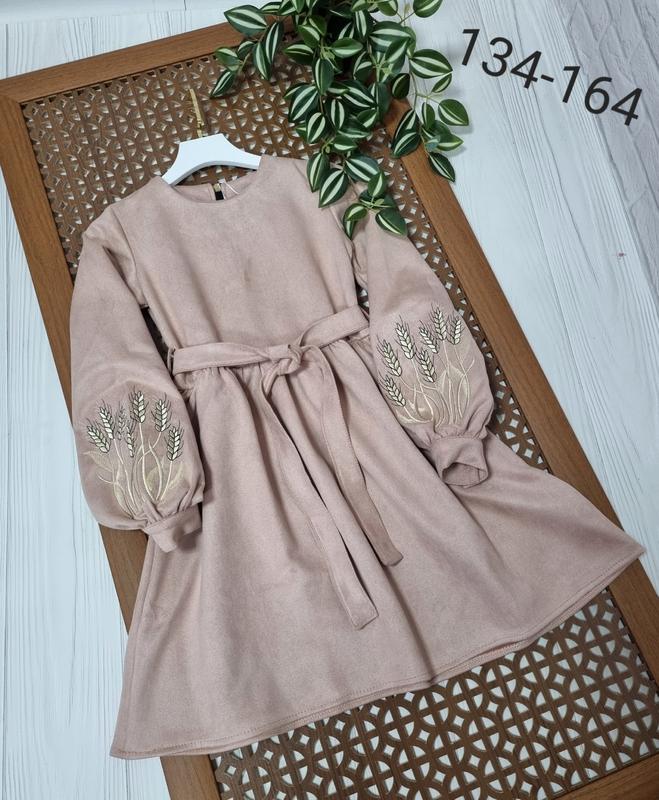 ландиш ✅В НАЯВНОСТІ!!! 💞Нежное платье с вышивкой "колосок" тканина замш в живую очень красивая поясок в комплекті очень красиво смотрится на ребенке РЕКОМЕНДУЮ 140(2 шт)-длина 73, пог 36,рукав 54 146(1 шт)-длина 77,пог 37,рукав 56 158(3 шт)-длина 82,пог 39,рукав 59 +-2 см