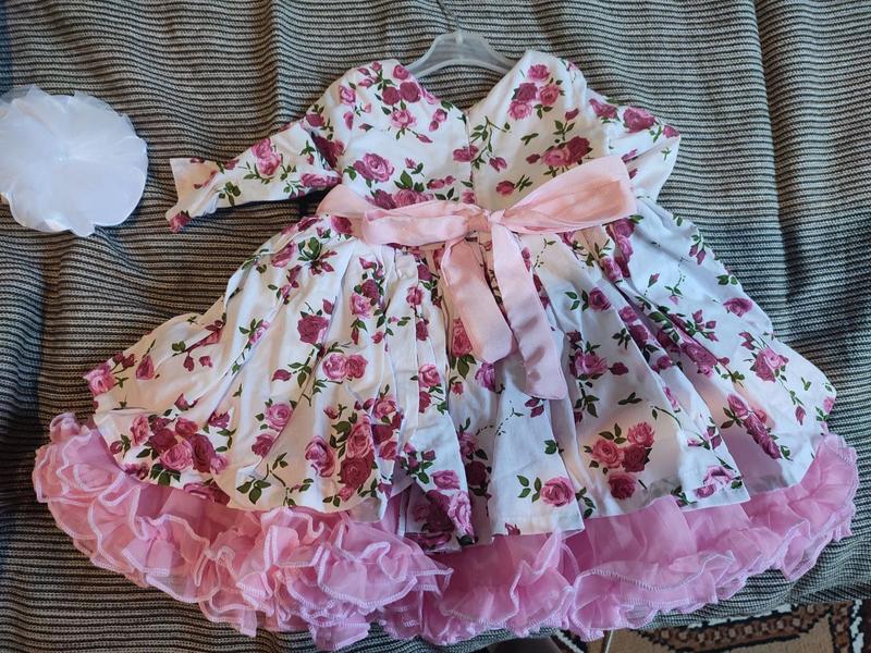 Пышное платье, с лентой, ткань с узором в цветочек. Приложение повязка на голову с белым цветком. ребенку в год именно то😘😁