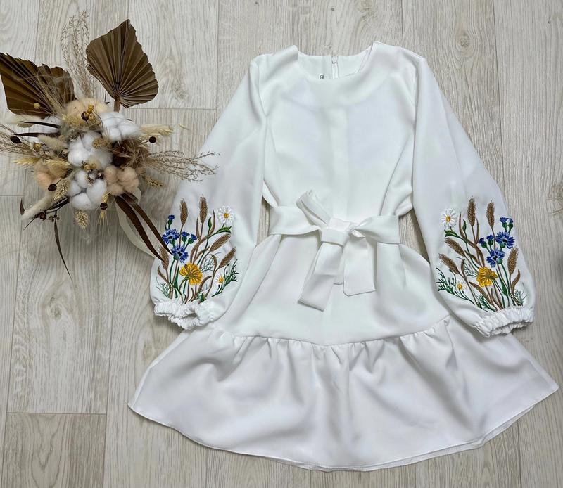 Нежное и хрупкое платье Тканина костюмний креп Качественная и приятная к телу Рукав пышный, вышивка на рукавах Есть манжет Пояс в комплекті КАЧЕСТВО ЧУДОВА!! РЕКОМЕНДУЮ!!! 140-1шт Длина/пог/рукав 140-72/39/47