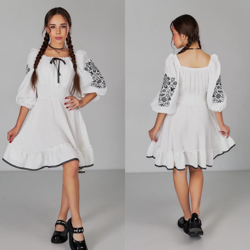 Сукня муслінова із вишитими рукави оздоблено мереживом та асемитричним низом в талії під резинку Тканина-муслін ГАРНА ЯКІСТЬ! Зріст/довжина/пог/рукав від горловини похибка+-2см 140-146/77/41/41-3шт 146-152/79/42/45-1шт