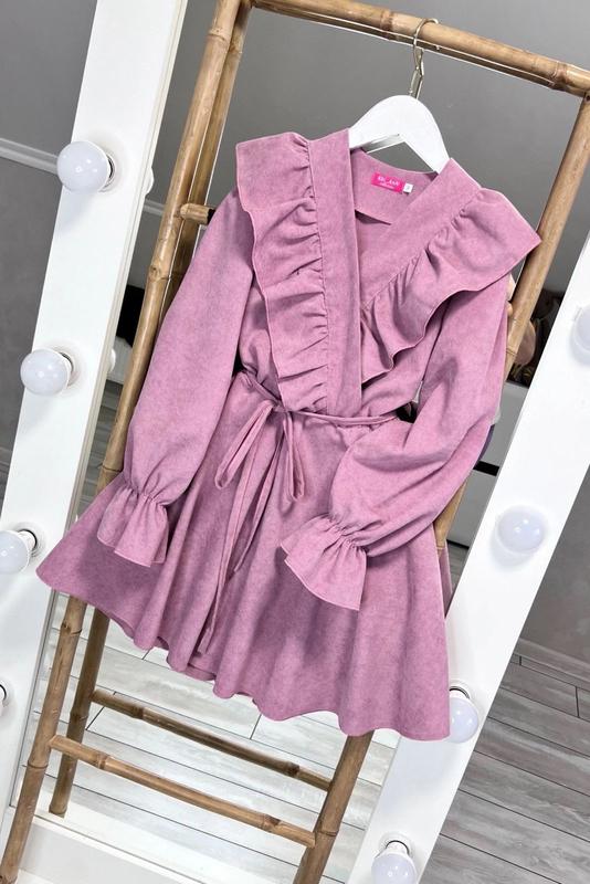 Невероятное, нежное платье для девочки Ткань микровельвет, крой - на запах, в поясе есть резиночка, украшенная рюшами, оригинальный рукавчик на резиночке с рюшей, поясок в комплекте очень приятный к телу Длина/рукав от плеча/п******** 146-8**********/59/41 158-86/62/43 164-88/64/45 +2см