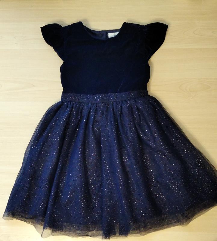 шикарное велюровое платье на 6-7 лет, юбочка трехслойная, два слоя фатина, верхний с золотистыми точками, на подкладке, сзади пуговицы, по талии фатиновый пояс отлично подойдет к образу нотки замеры: длина 63 пог 31, пот 31 плечи 25 состояние идеально