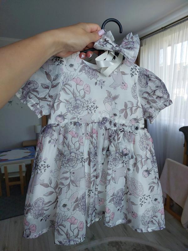 Очень красивое и нарядное платье от H&M, на девочку 12-18 мес Замеры на фото Состояние нового, одети 1 раз в 33.) Снизу коттоновая подкладка, сверху шифон) Очень красивый и небанальный принт, в птички и зайчики) В комплекте идет повязка на голову - бант)