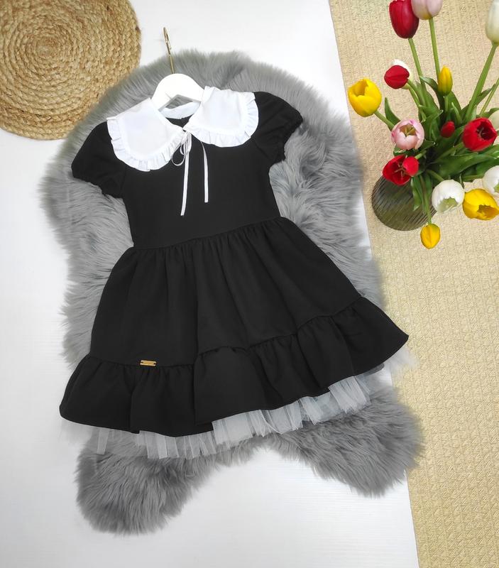 В наличии 🧡 Стильное платье для красавиц Тканина костюмка Воздушная, нежная, качественная Пышная юбочка с фатиновой вставкой В комплекте воротничок, который снимается Сзади застежка потайная молния РЕКОМЕНДУЮ Цвет черный замеры:длин/погрудей 116- 65/30см 122- 67/30 128- 70/32см 134- 73/33 140- 77/34 +-1 см