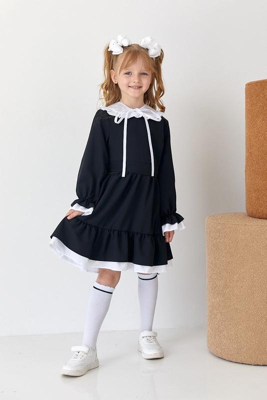 В наличии! Стильное платье для девушек. Хороший вариант в школу! Воротник сьемный. Поясок в комплекте. Тканина - супер софт Цвет - черный 116 синий - 140 Цена: 685 грн. Замеры: вместе с белой отделкой. 116 длина от плеча - 62см, полуобхват груди - 31см, рукав от горловины - 46см.