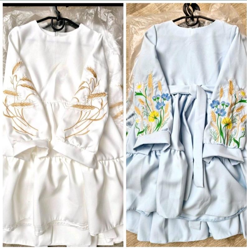Очень красивые платья, с вышитыми рукавами. Ткань барби. В двух цветах Молочная и голубая 128р длина 65 пог 35.5Рукав 46.5 134р длина 73 пог 35.5 Рукав 49 молочная 140р длина 76 пог 35.5 рукав 50.5 молочная 146р длина 77 Пог 36 рукав 53