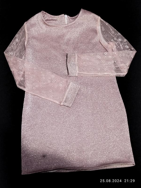 Платье очень красиво сидит, шикарного фрезового цвета с люрексом на девочку 8-9 лет в очень хорошем состоянии, есть малозаметное пятнышко. Длина изделия по спинке от плеча 62 см, полуобхват груди 34 см, длина рукава 49 см. Ткань тянется. Модель 4630Т