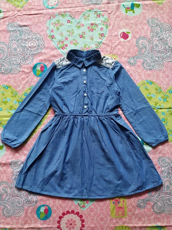 Модное,фирменное,джинсовое платье, платье с кружевом для девочки 5-6 р- H&M в идеальном состоянии. Длина-60 см, под ручками-35 см,рукав от плеча-40 см, от горловины-48 см