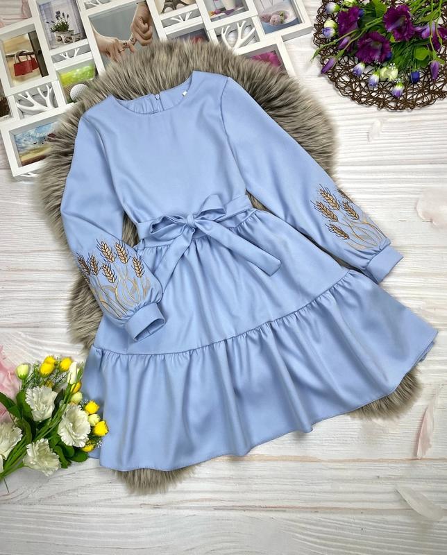 Нежное платье с вышивкой для красавиц 💗 Застегивается по спинке на молнию, завязывается под поясок ткань костюмка барби ЦВЕТ Голубой Замеры : Длина/пог/рукав от плеча 146 - 77/37/53