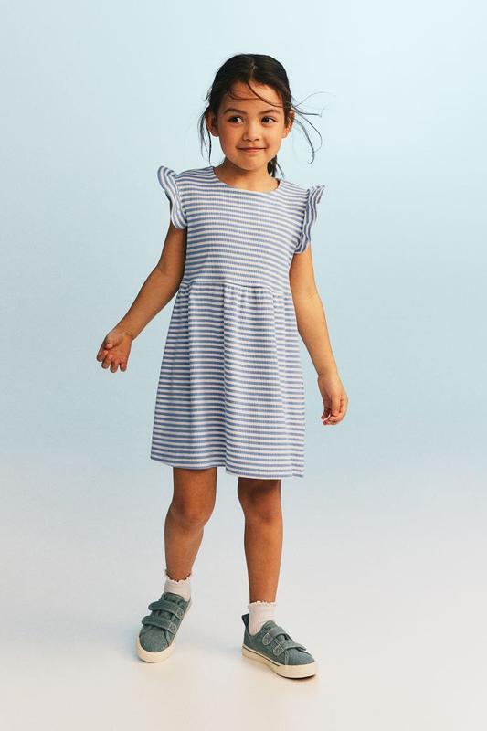 Платье из хлопкового трикотажа в рубчик.H&M Короткие рукава с воланами, собранный шов на талии и слегка расширенный подол. Склад Бавовна 95%, еластан 5% Размер EUR 98-104/ UK 2-4 Y Замер пог 30-33 пот 33-36 длина 55 EUR 110-116/ UK 4-6 Y Замер пог 32-35 пот 34-37 длина 61 EUR 122-128/ UK 6-8 Y Замер пог 33-36 пот 35-38 длина 66 EUR 134-140/ UK 8-10 Y Замер пог 36-39 пот 39-42 длина 73 Цена 200 грн