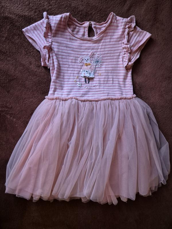 В удовлетворительном состоянии продам платье на девочку. Юбка пышная 3 слоя фатина + х/б подкладка. Есть зацепка на юбке, и ткань не идеально гладкая. На фото все показала. В целом смотрится очень красиво, есть фото на ребенке. Замеры длина от плеча до низа 63см, ПОГ 32см