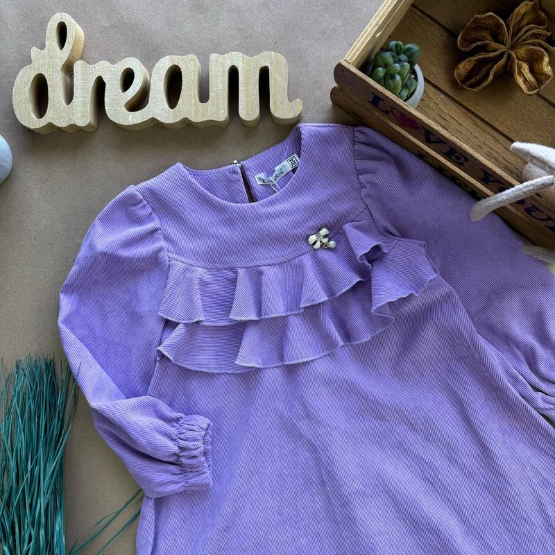 Ніжна та стильна сукня з вельвету. Вельвет рубчик відмінної якості. Рукава- ліхтарики. Спереду прикрашено рюшами. Гарно тримає форму. Ззаду- застібається на ґудзик. Розміри: 104 – рукав 37, довжина 55 110 – 40/58 116 – 42/60 122 – 44/63 128 – 46/65
