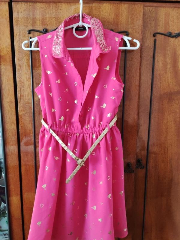 Детское платье, ткань шифон, подклад полистер, воротник украшен пайеточками, 9-10 лет(135-140), как новое, длина платья 78 см, длина до талии 32, ширина талии 60 см, об, грн 38, малиновый цвет.( отсутствие только на пояске на фото есть)