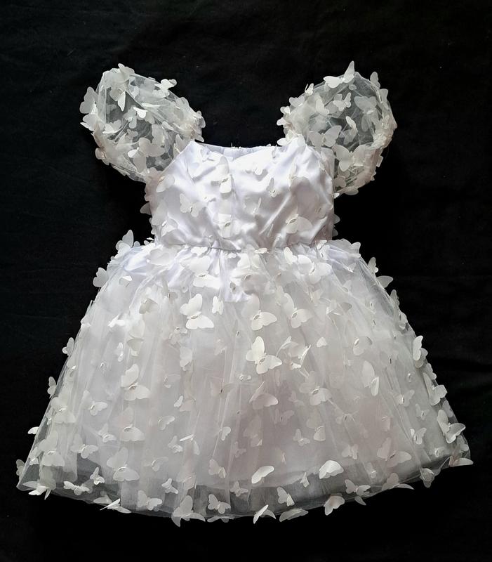 Неймовірно ніжна сукня у білому кольорі з метеликами. Рукавчик-ліхтарик, безліч об'ємних метеликів, на спинці замочок. Довжина (по нижній спідниці) - 56 см, довжина (по низу фатину) - 60 см, ширина по грудях - 30 см. Стан - новий Жодного разу не носили. Не вгадала з розміром.