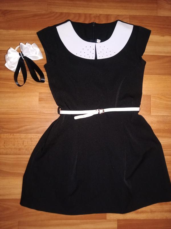 Чудова сукня для маленької школярки. Состояние новой, одевалась 2 раза. Воротник красиво украшен, сзади застегивается на молнию. Рост указан 128 но маломер, где-то на 116-122. Длина 60, ширина по талии 30 см. Без ремешка!
