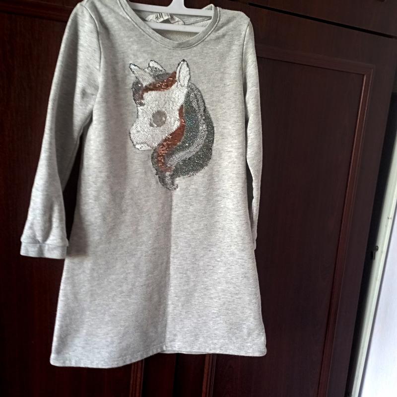 теплое платье для девочки ткань трехнитка пенье Петля не тянется аппликация единорожка пайетки более прорезиненные без пятен без катышков все в общем состоянии пол окружности груди 33 см длина 60 см длина рукава от горловины 45 см от линии плеча 40 см