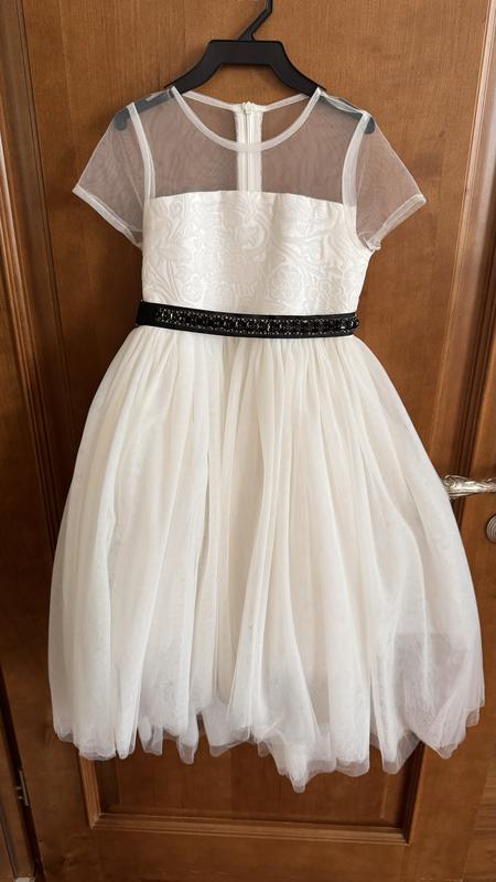Нежное, белое платье с асимметричным кроем в нижней части от бренда Gulliver. На рост 116см( 6-7роков) в отличном состоянии, без дефектов. В комплекте пояс (съемный) с камушками. ОТ- 60см, длина платья спереди- 54см, сзади- 90см. Застегивается на молнию. Отлично подойдет для новогодних праздников- образов снежинки.