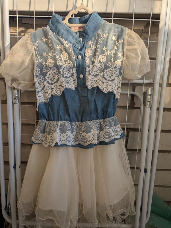 Отличное платье для девочки с тюлевой юбкой и верхом под джинс На размер 122-128 см Цвет тюля молочно-бежевый Длина до талии 28 см, длина юбки 37 см, пояс полухват 31 см На поясе вшитая резинка