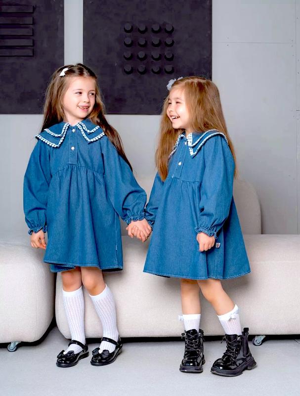 Сукня джинсова з ажурним комірцем, виглядає вау. Розмір є 110 та 120.Всі фото реальні. Заміри даю. Пересилаю швидко в день замовлення