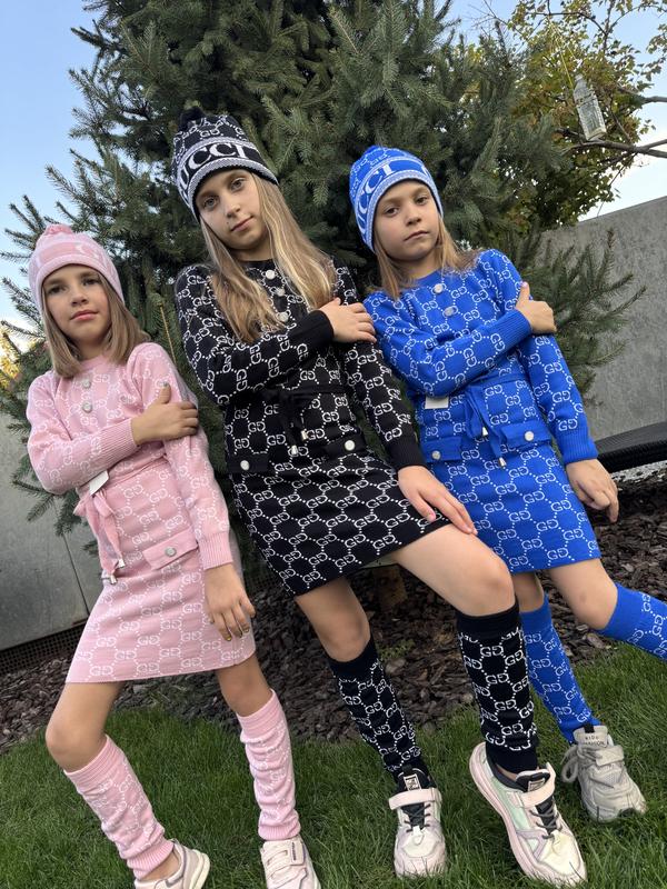 Вязаный набор, тонкая вязка, платье + шапка + гетры.